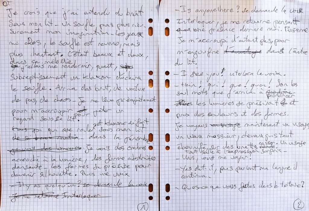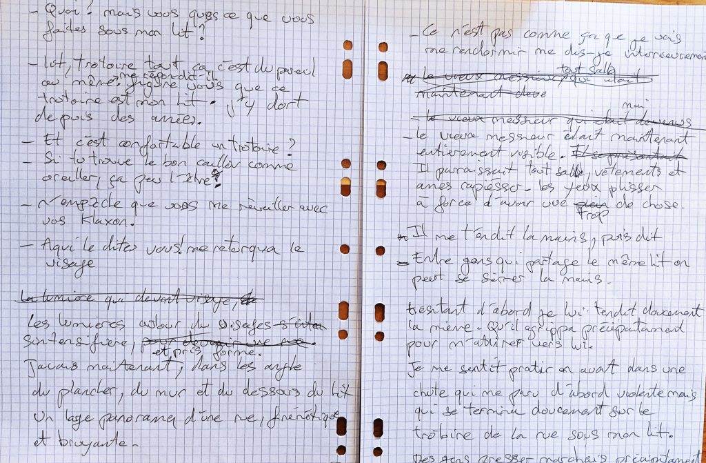 Maud – Je crois que j’ai entendu du bruit sous le lit. Un son furtif. Un truc sournois, rapide, qui se faufile en douce. Non c’est sûr. Enfin je crois. Il y a quelque chose, juste sous mes fesses, qui gigote, parallèle à mes jambes. D’autres jambes peut-être. Quelques pieds qui frétillent à quelques centimètres des miens. Tiens ça recommence. Ça grince, ça frotte. Ce bruit, je le connais. Je sais, je connais. Je ne connais que trop. C’est le bruit. C’est de la peau froissée. Des os qui s’écrabouillent.