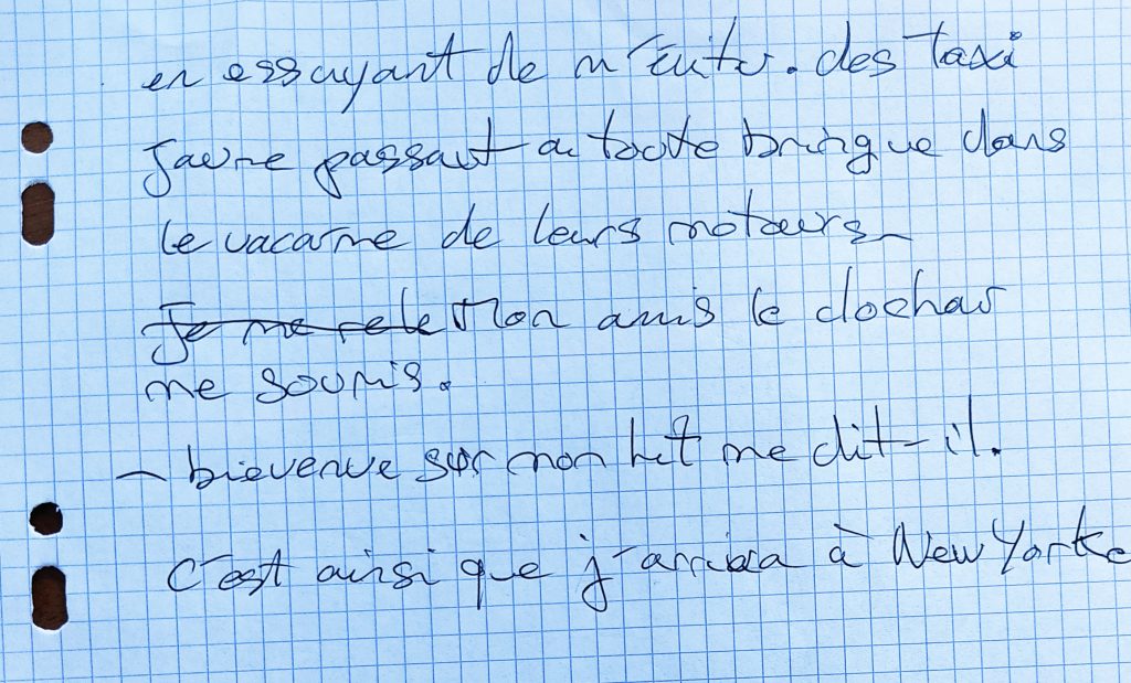 J’écris à mon amant. Cher amant : c’est crado chez moi, je n’ennuie, il n’y même pas de petite souris ni de trésor sous le lit: c’est pour ça que je pars à New York .