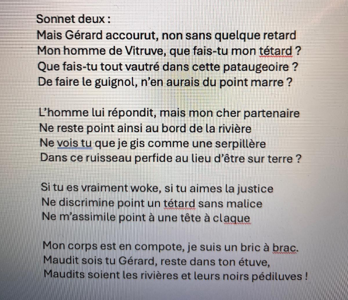 PH (bis) – Gérard ventousa sa partenaire woke dans le pédiluve. Elle lui fila une claque qui le cloua à terre contre le carrelage de la rivière de chlore. Personne ne pourrait faire un sonnet avec ça, sauf un esprit malade.